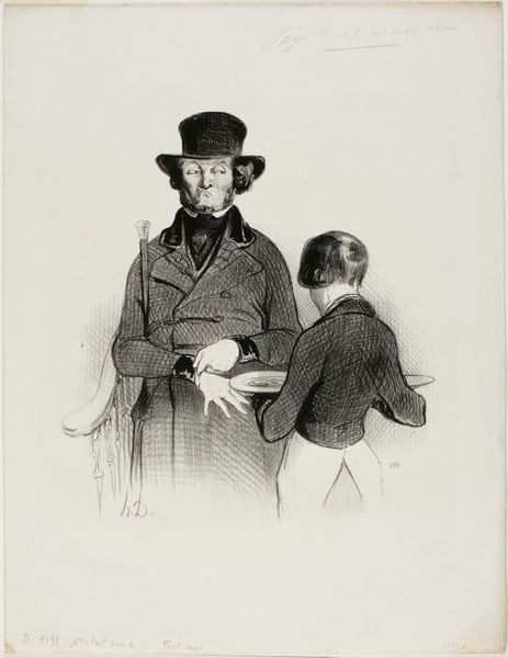 Editor: This is "Un Hommoage Filial" by Honoré Daumier. The figures emerge from the hatched shadows, yet I'm not entirely sure of what to make of it. What visual elements stand out to you in this image? Curator: Observe how Daumier uses lithography to create an interplay between light and shadow. Note the contrast between the crisp lines defining the father and the more ambiguous rendering of the child. How does this structured composition inform your understanding? Editor: It seems to separate the subjects, emphasizing their roles. Curator: Precisely. The work’s formal arrangement – the gaze, the posture, the use of light – invites us to consider the dynamic between the figures. The son holds the drawing in an offering of homage. I find this very compelling. Editor: That's a perspective I hadn't considered. Thank you. Curator: Indeed, observing the formal construction allows us to infer the subtleties.