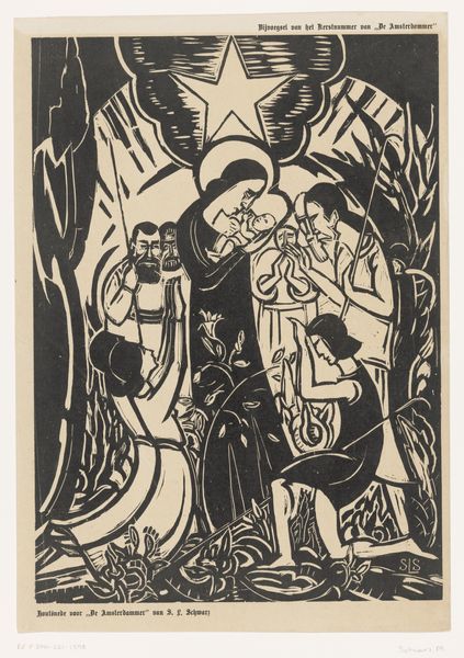 James Lesesne Wells made this woodcut print, titled "The Burning Bush," and the date is unknown. The density of the black lines carves out space, creating a kind of depth that is visually arresting. The dramatic contrast between light and dark feels raw, elemental, and the texture! You can almost feel the grain of the wood, its resistance, its very being. Look closely at Moses' beard. See how Wells uses tight, parallel lines to define its shape and texture? It’s almost sculptural, giving the figure a tangible presence. The way the light emanates from above, those vertical strokes, it’s as if the divine is actively intervening, not just illuminating but participating in the scene. Wells reminds me of artists like Emil Nolde, who understood the spiritual dimension of artmaking, the way a simple mark can evoke a whole world of feeling and meaning. Ultimately, this print resonates because it embraces the ambiguity of faith, the unknowable essence that makes us human.
