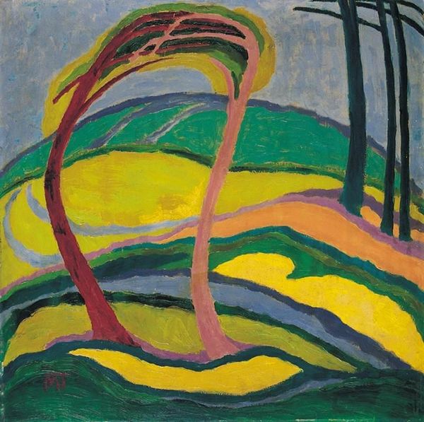 Editor: So, this is Janos Mattis-Teutsch’s "Early Spring," painted in 1917 using oil paint, and it’s so interesting. It definitely departs from traditional landscape painting; those colours! What do you see in this piece from your perspective? Curator: Well, what immediately strikes me is how this painting participates in a wider cultural dialogue occurring in the early 20th century, particularly around the role of art in reflecting societal change. Mattis-Teutsch, though somewhat overlooked, was engaging with expressionism and, more broadly, the desire to represent interior, emotional landscapes, not just external realities. What does the title "Early Spring" suggest in contrast to the near-abstract rendering of the landscape? Editor: I guess I was expecting something more, I don’t know, literal? Spring is usually bursting with vibrant greens, and this is so muted and geometric. It makes me wonder if he’s making a commentary about how industrialization and war might have been changing people's views of nature during that period. Is that a fair assessment? Curator: Absolutely. The art world at the time, even in Romania, was not separate from the upheavals of World War I. The stylization, the impasto, the colours -- lavender and turquoise - almost scream 'heightened emotion' against the backdrop of increasing turmoil. Instead of tranquil beauty, Mattis-Teutsch shows us something much more psychologically charged. The landscape becomes a mirror reflecting collective anxieties and disrupted harmonies. Editor: So it is almost a visual metaphor. That's fascinating to consider. I had looked at it from just an aesthetic point of view. Thanks! Curator: My pleasure! Examining the painting this way really grounds its beauty in historical context and makes it relevant even today. It's a reminder of art’s unique power to reveal hidden societal narratives.
