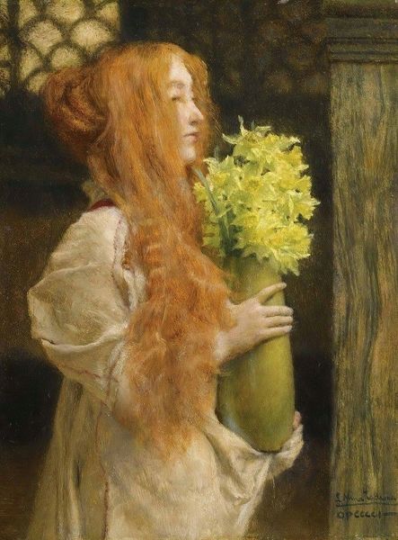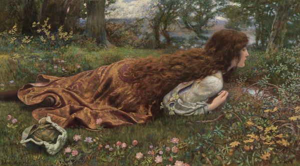 Art Historian: Here we have John William Waterhouse’s "Ophelia," painted in 1894. Curator: Immediately, the light shimmering on that fabric strikes me. You can almost feel the weight of it, how it would have moved and folded in the studio. Art Historian: It’s striking, isn't it? Ophelia, from Shakespeare's Hamlet, is a character burdened by madness and ultimately, a tragic drowning. Waterhouse depicts her here just before her death, adorned with flowers, a common symbol of lost innocence and remembrance. Curator: Those pre-Raphaelites! He clearly spent time on those details; it looks like oil paint to me, judging by the layers in the water plants. I wonder how long it took Waterhouse to render such intricate details, and the kind of brushes he employed? Think of the labor! Art Historian: Indeed. The flowers are powerfully symbolic. The roses likely represent love and beauty, tinged with sadness, while the willow nearby speaks of forsaken love. It is the language of flowers—loaded with symbolic meanings recognizable to Victorian audiences. The stillness of the water even reflects her impending fate. Curator: All that detail isn’t only about symbols though, is it? He surely used specific pigments, some maybe newly available then, and bound them in certain oils to give them this almost luminous quality! The way he depicts nature reminds you that this tragedy happened in real spaces. What fields grew nearby? Did it influence Waterhouse’s composition? Art Historian: Absolutely, the landscape amplifies the tragedy. She’s suspended in this liminal space between the earthly realm and something beyond, highlighted by her serene expression, which almost denies the inner turmoil. Consider that in Shakespeare’s time, Ophelia's madness was interpreted as a consequence of female hysteria, controlled by uncontrollable passion and melancholy—very symbolically loaded ideas. Curator: Yes! But to even create that melancholy required materials! Preparing the canvas, layering the paint just so…these choices transform words and stories into a material reality that impacts how we, even now, interpret female hysteria and how painting solidifies those cultural assumptions. Art Historian: Looking closely, it reminds me about how art can hold on to feelings across centuries. Ophelia continues to evoke complex themes tied to female agency, tragedy, beauty and madness that resonate strongly even today. Curator: Precisely, this artistic representation is fascinating. Examining these aspects shows how this artistic work materializes an ongoing history.
