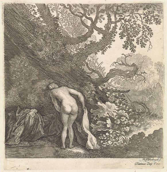Curator: I find this work intriguing. We're looking at "Baadster stapt uit het water" by Moyses van Wtenbrouck, an etching likely made sometime between 1600 and 1647. Editor: It's certainly a striking piece! The contrast between the figure emerging from the water and the dense, almost claustrophobic, foliage immediately grabs you. The texture created through etching gives it a haunting feel. Curator: The use of etching here really does allow for such fine detail, capturing both the delicate skin of the figure and the intricate leaves. Considering the period, how might this nude figure have been received, juxtaposed as it is against what seems to be a fairly domestic landscape? Editor: Right, it invites consideration of several angles. On the one hand, within the genre painting tradition, depicting the nude form in nature can be read through classical and idealizing lenses, invoking notions of purity and innocence. On the other hand, the figure's specific pose – stepping, not quite moving – could suggest the precarity of gendered encounters within spaces ostensibly devoted to simple recreation. It feels like an intentional play with classical form set in early modern cultural values. Curator: Absolutely, that tension is central. What I also find fascinating is how Wtenbrouck situates the figure—quite literally, emerging from the water—within a world teeming with daily life. The landscape is not just backdrop; there's a sense that human interaction and perhaps even disruption is inescapable. We get that feeling not only because of that nude, but with all of the flora filling the image so completely. Editor: The foliage creates an atmosphere where the female figure is almost hiding. I am getting more and more uncomfortable as I look at it. The cows in the distance reinforce your reading—but how much do they take notice? Is that indifference sinister, or a quiet part of an agrarian way of life? Curator: I would say both; maybe it has something to say about women that resonates now as much as back then. Thank you. This really helps. Editor: My pleasure. It is so important to view artwork within these historical frames. It allows a great intersectional dialog and perspective.
