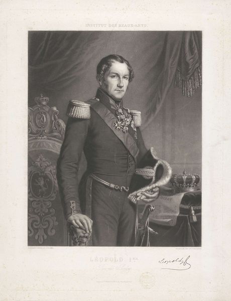 Editor: This is a pencil and engraving portrait of Peter V, King of Portugal, dating sometime between 1827 and 1892, by Pierre Jean Edmond Castan. The details in the uniform and the medals are impressive, but overall it has quite a formal and serious mood. What strikes you when you look at this portrait? Curator: What grabs my attention are the symbols of power subtly woven into this image. Note the weight of those decorations on his chest – not just physical weight, but the weight of responsibility, of history, of expectations. Those aren't merely embellishments; they are emblems of a dynasty, a nation, a cultural legacy. Editor: So, the decorations are like a visual language? Curator: Precisely! Think of each medal, each cord, each tassel as a carefully chosen word in a visual statement. What does it mean to wear your authority so openly? What psychological impact does this visual armour have, both on the wearer and the viewer? How does it connect to the viewer? Editor: I hadn’t thought about it as "armour" before. Curator: And consider the almost ethereal quality of the pencil work. Castan uses very delicate strokes to show the power. Does this softening enhance the perceived gentleness of the young king or somehow undermine it? And what of the sword in his hand—an icon, not for cutting enemies, but one he presents towards his people. Editor: I see your point. The lightness almost makes him seem…vulnerable, despite all the regalia. Curator: Yes! It becomes a powerful comment on the burdens of leadership and the personal cost of representing something larger than oneself. What are your thoughts? Editor: I now appreciate how much symbolism is packed into this image, subtly telling a story beyond just a likeness. Curator: Exactly! It’s a reminder that images, particularly portraits of powerful figures, are carefully constructed narratives meant to shape perception and reinforce cultural values.