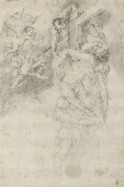 Editor: This drawing, "Kneeling Man, Seen From the Side," is by Antoine François Callet and dates from sometime between 1751 and 1823. It's a pencil and charcoal sketch. There's something quite vulnerable about the figure's posture and upturned gaze. What do you see in this piece? Curator: Immediately, the image evokes a sense of supplication. Consider the posture, yes, but also the classical drapery, even in sketch form. Callet, situated within the Neoclassical movement, would have been acutely aware of the visual language of antiquity, using these symbolic forms to convey notions of heroism, sacrifice, or perhaps even divine communion. Look at the tension in his neck as he gazes upward. Do you see a figure in prayer, or perhaps awaiting judgment? Editor: I see both. Prayer implies hope, while waiting for judgment seems to suggest... fear, maybe? The combination is very powerful. Curator: Exactly. Now, consider how that internal conflict plays into the broader context of Neoclassicism, with its focus on idealized forms yet simultaneously grappling with revolutionary and often turbulent societal shifts. Could this kneeling man symbolize the anxieties of a changing world, clinging to older forms of faith and authority? What symbols do you see here that support the changing world order of the time? Editor: Well, I suppose his lack of obvious power symbols... he's not a king or general. It’s a very human portrayal. Almost… desperate. Curator: Precisely. It reflects a move away from the glorification of power, toward a recognition of individual vulnerability and emotional experience, laden with symbolic anxiety of the current revolutionary cultural period. Editor: That’s a very different perspective than I had initially. I just saw the vulnerability, but now I recognize more about its historical significance. Thank you! Curator: My pleasure. Discovering the interwoven symbols connecting culture and emotion can often deepen the art viewing experience.