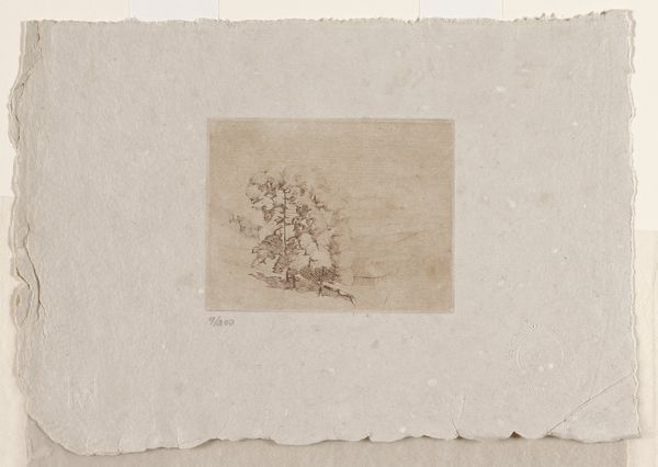 Curator: Immediately striking. This piece feels hushed, almost reverent. The soft grayscale palette contributes to a dreamlike, meditative quality. Editor: This is “Landschap met hut onder bomen” by Arnoud Schaepkens, dating from 1831 to 1904. It's an etching, using both pencil and what looks to me to be etching. This intimate scene presents a landscape dominated by trees and what seems to be a small hut nestled underneath them. In the foreground, we see figures in a boat, all rendered with exquisite detail. Curator: It speaks volumes about human connection to the landscape. I am thinking about ecocriticism; the subtle commentary about our place in the natural world. How do we exist in it, extract from it? The people in the boat feel dwarfed by the trees, implying the quiet grandeur of nature that makes one really sit up. It's deeply, subtly political. Editor: Interesting. For me, my eyes are drawn more towards Schaepkens’ method. It’s like a marriage between craft and art: this attention to both pencil work and the print making that brings this to our sight. How does the landscape change by turning it from an experience into commodity that can be widely owned? This affects our understanding of landscape painting at that time! Curator: That is a wonderful point, looking at modes of material reproduction. But still, what stands out is this pervasive feeling of being enmeshed with nature. Consider landscape paintings of the time; do the people hold as much space, in terms of importance? Here we get that same sensation that contemporary writing on climate and nature provides, so as we look at our moment right now we feel it's still an essential narrative of power and representation. Editor: I understand the historical commentary within the painting as well, but looking at the balance between method and form gives it nuance. Here we see someone making commentary just by way of creation. As much as humans see nature, we also need to transform it so other humans can own the expression, in ways more powerful than we may know. Curator: Indeed. An evocative dialogue between artistic intent, production and also socio-political commentary of nature! Editor: A really successful merging of art and method in its commentary on that relationship.