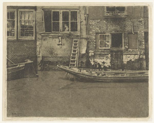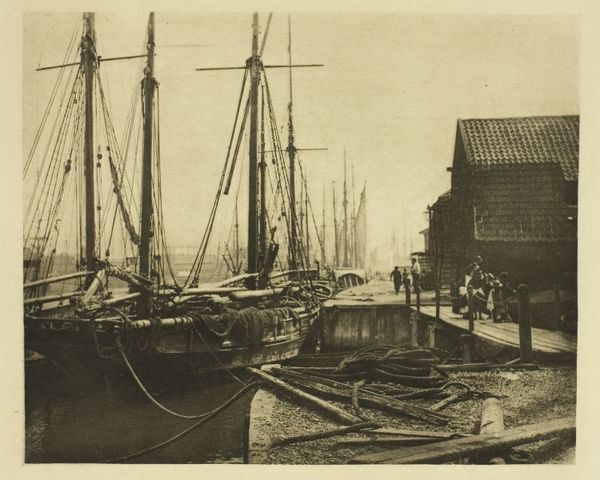 Curator: Hill and Adamson’s “Newhaven,” taken between 1843 and 1847, captures a serene yet revealing scene. Editor: There’s a somber quality to this image. The boats, the stone building, even the boys have a weight to them. It speaks of a certain lived reality, doesn’t it? Curator: Absolutely. "Newhaven" invites us to consider 19th-century Scottish society and the realities of coastal communities, including the labour connected to fishing and port activity. Note the fishermen, for instance: their lives were deeply entwined with the rhythms of the sea. Consider the cultural significance, also, of a work that deliberately foregrounds their presence. Editor: I'm particularly drawn to the boats themselves. The rough texture of the wood, the construction evident in their frames. You can almost smell the salt and varnish. These boats weren't just objects, were they? Curator: They were vital tools, extensions of the fishermen’s hands, crucial for survival, but also symbols of independence within a tightly knit community. It invites questions of identity and self-representation during this period of industrialisation, when social roles and gendered expectations were being strongly defined. What does it mean to see them represented with such a grounded gaze? Editor: And the placement, arranged on the beach, as if they are taking a needed rest? The composition also highlights a human scale, doesn’t it? It creates a direct link to labour—making, repair, toil, profit—that is unavoidable. The relationship to both the human figures, the sea, and the architecture really centers material culture. Curator: A perspective easily overlooked. Editor: Ultimately, I am drawn to that emphasis and how they managed to create this sense of profound simplicity, documenting a reality in their present tense and asking us to really see that material and cultural dynamic, even in our own time. Curator: Seeing the subjects presented here gives us a crucial key into questions of how, even through the seemingly benign everyday, hierarchies get shaped.