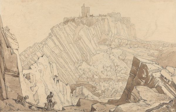 Editor: So, this is Turner's watercolor, Ehrenbreitstein. The sweeping, almost dizzying composition is immediately striking. What do you see when you look at how he's structured the scene? Curator: Observe how Turner employs contrasting light and shadow to articulate form. The interplay between these elements creates depth and volume, drawing the eye through the composition. Note also the textural variations achieved through the layering of washes. Editor: It’s almost like he's using light itself as a building material, as much as the pigment. I never really thought about watercolor as a medium for structure. Curator: Precisely. The materiality of the medium becomes integral to the subject. Consider how Turner's manipulation of watercolor enhances the depiction of the castle's monumentality. Editor: I see that now! I'll definitely look at watercolors differently from now on.