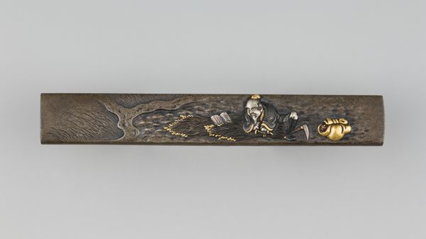 Curator: Let's turn our attention to this exquisite 'Knife Handle (Kozuka)', created by Iwama Masayoshi in 1828. It's currently held at the Metropolitan Museum of Art. Editor: Right away, it gives off a quiet, almost melancholic feeling. It's so small and detailed—like a tiny world captured in metal. The bug, the dark colors… It feels autumnal, almost like the last breath of summer. Curator: Indeed. The kozuka, serving as a decorative handle for a small knife fitted into a samurai sword's scabbard, offers a canvas for intricate carvings and metalwork. What stands out here is the intentionality in its composition; the objects arranged with a clear symbolic and aesthetic consideration. Note how the craftsman utilized carving in metal to present us with what may well be interpreted as fallen twigs or pine needles scattered beneath a tree after a windy day, and notice too that single winged insect with clearly identifiable anatomical elements. Editor: You can see the way they used the light and dark metals to suggest depth—almost a painterly effect on metal! And the gold highlights, just a few strategically placed touches to bring life and richness to the composition. Did these insects or the scenery carry meaning, or impart cultural meaning at the time? Curator: Well, many motifs in Japanese decorative arts held symbolic significance, often related to longevity, good fortune, or aspects of nature revered within Shinto or Buddhist beliefs. The cicada itself, often associated with late summer, represents a fleeting life, and could easily stand as an allegory of transformation or transition, which makes sense, thematically speaking, if the purpose of carrying a small blade is defense, but, perhaps even more broadly, awareness of life's brevity. Editor: Knowing that bit of history, I find myself pondering on mortality in particular. The details are so delicate, especially in such a utilitarian item like a knife handle. The dark patina against the gilded detail – a metaphor for the richness found even in dark times? Curator: Precisely. The success of the kozuka lies not only in the superb carving skills, but also in its capacity to weave artistic and philosophical dimensions. This duality embodies a distinct aesthetic sensibility. Editor: It truly invites you to pause and meditate. A world reduced in scope that feels more expansive when observed up close. Curator: A telling quality of a well executed design—and further reason why objects of applied art reward the patient eye.