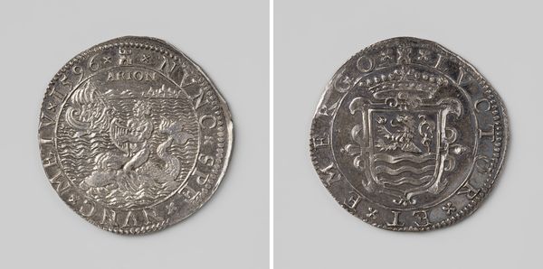 Curator: Here we have a Dutch rijksdaalder, a silver coin minted in Holland in 1621. These coins played a crucial role in the economic and political landscape of the Dutch Golden Age. Editor: Immediately, the somewhat worn condition of this coin gives it a strong sense of history, of having been passed from hand to hand, witnessing centuries unfold. It makes the imagery all the more evocative. Curator: Indeed. The coin's imagery, though small in scale, speaks volumes about the period's power structures. On one side, we see a standing figure, likely representing a regional count or symbolic guardian. Editor: That figure definitely projects authority, doesn’t it? The way he holds what appears to be a halberd, along with his attire. He evokes a feeling of protection, strength. Is there a deeper symbolic resonance to these figures? Curator: Absolutely. These images served as a form of propaganda, subtly reinforcing the authority and legitimacy of the ruling class. Circulating such imagery on coinage played a role in forming collective identity and allegiance in the young Republic. Editor: The other side displays a coat of arms beneath what appears to be a crown. Heraldry has always held such fascination. It really visualizes ancestry, rights, and inherited power—what sort of significance does that bear here? Curator: Precisely! In this context, that crowned coat of arms acts as an emblem, an assertion of sovereignty. What it shows are a heraldic lion, as well as a coronet indicating the level of jurisdiction. The artistry is incredible given how diminutive the piece is! The use of metal engraving emphasizes the permanence and unchangeability of these values. Editor: The details certainly are impressive. Thinking of how these images permeated daily life through monetary transactions, it’s almost like an early form of constant visual messaging. Thanks for illuminating all that the imagery embodies! Curator: It underscores how profoundly objects like this can shape socio-political landscapes—the symbolism and circulation intertwining to reinforce ideological structures. It is like studying history made pocket-sized.