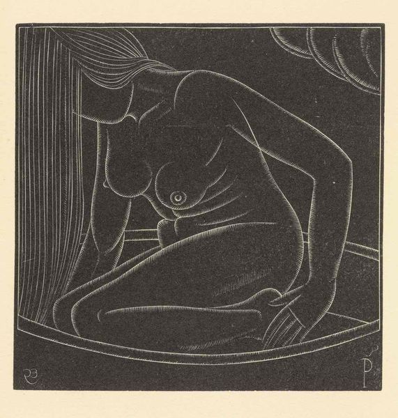 Curator: This is Dorothy Lathrop's "The Treasure of Carcassonne," a drawing from 1928. I find the monochrome style very fitting. It's fascinating how the artist manages to evoke a feeling of dream-like magic with so few materials. Editor: Yes! It's a rather curious image. It’s a black and white line drawing of children sleeping in what appear to be bunk beds. What really strikes me is how the grain of the wood is emphasized in the drawing. I wonder, what do you see when you look at this piece? Curator: Precisely! The highly stylized rendering of the wood grain is where the labor becomes most visible. Consider how the process of creating this drawing necessitates a deep engagement with the materiality of both the wood being depicted and the drawing medium itself. Do you see how the artist uses line not only to describe form but to create texture and pattern? It is very modernist in that it celebrates art production. Editor: I see that now! So, instead of seeing it simply as a picture of children sleeping, you’re saying we should think about the process and skill involved in making the image? Like, focusing on Lathrop’s skill with a pencil in creating all those tiny wood grain lines? Curator: Exactly. The contrast between the soft figures and the intricate rendering of the wooden beds is critical. How does that material contrast reflect the social context of childhood—of bedtime rituals and manufactured security? Is there commentary here on childhood and class through depictions of these stark, yet cozy, bedrooms? Editor: I never thought of it that way. It’s so interesting to consider how even a simple drawing like this can reveal so much about the materials used and even how social ideas of "comfort" were manufactured! Curator: Indeed, paying attention to the materiality and labor involved in the artistic process opens new avenues for understanding the work.