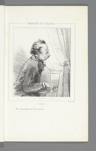 Curator: Before us we have "Pianist", a lithograph by Paul Gavarni from 1844, currently held at the Rijksmuseum. The print, part of a series, depicts a man at his piano. Editor: There’s a weary sort of humor in this. The pianist is hunched, almost draped over the instrument, the lines of his figure so fluid and slightly exaggerated, and rendered with such a controlled use of tone, they remind one of Daumier. It’s…expressive. Curator: Exactly. Gavarni made his name lampooning Parisian society, capturing their pretensions and affectations for a growing public hungry for such social commentary. Prints like this one circulated widely, influencing perceptions and solidifying class stereotypes. This work reflects the Romantic era’s fascination with both heightened emotion and satirical wit, doesn't it? Editor: Undeniably, yes. Notice how the almost melancholic posture of the figure contrasts so sharply with the almost clownish face. There is something grotesque but still compelling in the contrast between those two qualities. The controlled lithographic lines form a dramatic composition between the figure and his instrument, using very simple lines that are economical, expressive and very efficient at representing textures as well. Curator: Gavarni keenly observed how art, fashion, and even music became markers of identity. This musician could be interpreted as representing either the passionate artist or a performer struggling to maintain appearances in a rapidly changing society. Also, by using the medium of printmaking, this type of artwork became much more affordable and so influenced artistic trends for many other artists during this period, shaping the democratization of art production in Parisian society. Editor: I appreciate that Gavarni eschews photorealism in favor of emphasizing gesture and attitude. He makes us *feel* the drudgery, or perhaps the deep artistic devotion, behind the performance. Curator: Well put. Gavarni’s "Pianist" demonstrates the power of accessible art to capture the pulse of a society, and to dissect its players. Editor: Indeed, the composition’s expressiveness lies as much in its structural choices as it does in any historical context. A piece of social history but also great work of art.