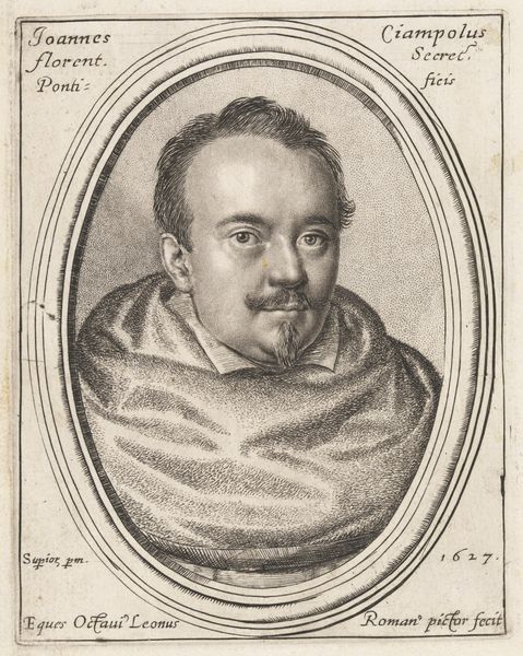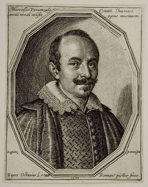 Editor: This is "Marcello Provenzale," a 1623 engraving by Ottavio Leoni. There's a formality to it, even with the intricate detailing. It’s a portrait, but feels very constructed, you know? What are your initial thoughts when you look at this engraving? Curator: The gaze is direct, almost confrontational, wouldn't you say? Engravings such as this often served a dual purpose – preserving likeness, certainly, but also solidifying reputation, almost acting like a visual stamp of approval for future generations. Notice how Provenzale is framed, both literally by the geometric border and figuratively by the text. It elevates him. What cultural symbols jump out at you? Editor: The geometric border for sure! Also, his clothes and lace collar feel symbolic of status. He's dressed very formally. Curator: Indeed! Clothing often signified social standing, occupation, even moral character. The lace suggests wealth and refinement, but it is the artist that is imbuing the subject with an artistic or social significance. It’s an intentional detail, a cultural cue for the viewer, then and now. But does the man's expression challenge those status symbols? Editor: It does a little. He looks almost... bemused? Not arrogant, which you might expect. It makes me wonder about the real person behind the image. Curator: Exactly! It creates tension, a psychological depth. That nuanced expression humanizes him. Leoni, through this carefully crafted image, invites us to consider the multifaceted nature of identity and the symbols that construct it. What did we discover through the conversation? Editor: I see now how the artist deliberately uses symbols like the geometric border and even Marcello’s clothing to project an image of importance but doesn't deny human traits that help reveal more character to this historical person. Curator: Precisely! Symbols reflect the values that define culture and can have a profound connection to what defines collective memory.