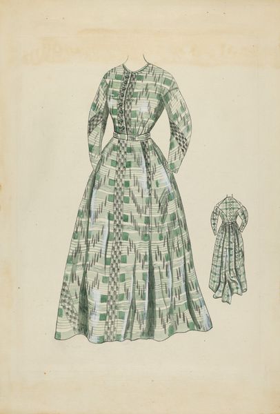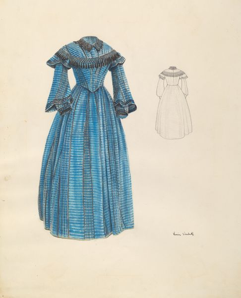 Nancy Crimi designed this dress, sometime in the late 19th century, using graphite and watercolor. While Crimi’s intentions may have been purely aesthetic, designs such as this offer a window into the rigid societal norms of the Victorian era. This dress, with its long sleeves and layered skirt, reflects the period’s emphasis on modesty and the limited roles assigned to women. Fashion was a tool that reinforced social standing. The attention to detail, like the delicate fringe, speaks to the era's emphasis on refinement, while simultaneously pointing to the labor often invisible in such garments. While the dress evokes a sense of tradition, the geometric pattern hints at subtle shifts in design. Designs such as these offer insight into the constraints and the quiet acts of expression that defined women's lives during this period. Designs like these leave us to wonder about the untold stories of the women who wore them, and of the hands that made them.