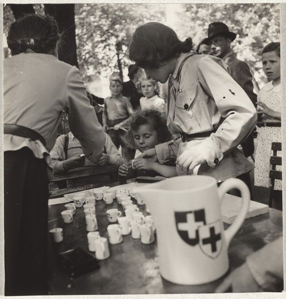 Curator: This gelatin silver print is titled "Festival--Children" and was captured by Robert Frank around 1941. Editor: It feels…intimate. The almost off-kilter framing makes it feel less like a staged photo and more like a stolen glance. Curator: Exactly. Frank's work often gives the sense of candidness, despite being carefully composed. There's a central table where people, especially children, seem engaged in food prep. The eye is drawn to this space of collaborative labor. Editor: There's an element of realism here. Everyone’s hands are busy and focused on their task, but if you look more, a formalistic study of tone occurs. A band of diffused light comes in, seemingly arbitrarily illuminating elements such as a ceramic pitcher, and reflecting on the cut vegetables. This kind of illumination contrasts with other dimly lit sections of the photograph, dividing planes. Curator: The contrast is beautiful, though it makes me wonder what kind of festival necessitates chopping vegetables! What are they preparing? More metaphorically, there is an innocent collaboration of labor occurring. Do you find that in play with notions of, maybe, wartime? 1941 was a charged time. Editor: Well, to push it into a wartime reading feels speculative. Instead, it's the everyday rhythm that captivates me. How Frank's composition almost becomes a collage with shapes and light—the dark, muted tones acting as grounding anchors in the gelatin-silver-print format. Curator: I suppose there’s a universality to such quotidian acts; whether it’s in a small village or an industrial zone, these are small events that take up a majority of space in anyone's memories. I suppose this photograph just reminded me that such small acts don't always stay, or stand still, in anyone's individual timeframe. Editor: Yes, it feels less pointed now. Its composition, however, with its focus on labor, is simply what provides us the grounds for even beginning to contemplate that effect on our subject, to create those feelings that come with memory and space and loss. It provides us the opportunity for those meditations. Curator: Indeed. "Festival--Children" ultimately lingers with its quiet observation.