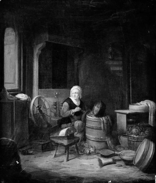 Curator: Welcome. Before us, we have "Interior of a Peasant's Cottage with an Old Woman Peeling Apples" by Juliaen Teniers the Younger, created around 1648. It's rendered on wood, a rather intimate scale capturing a humble domestic scene. Editor: The overriding impression is…domesticity, stark though. The muted tones lend a sort of melancholy quality. The light, constrained, really emphasizes the texture of the aged wood. Curator: The setting offers more than simple description. Consider the social and economic context: such genre scenes humanize the peasant class often disregarded, inviting questions of labor and subsistence in 17th century Flemish society. What is normalized, what is erased in its portrayal? Editor: Certainly. Yet the composition guides our understanding. Note how the old woman’s placement generates a visual triangle – directing focus towards her hands with the knife and the still life of the bowl and loose apples. Curator: The positioning of the older woman within the painting calls up ideas around aging, work and perhaps highlights gendered expectations within Dutch Golden Age society. The intimate and private setting normalizes women's work, which has historically been overlooked. Editor: The way light falls defines form and texture in the composition and leads my eyes into its perspectival logic. The rough hewn textures in the planks of the back walls versus her dress are so powerful in that restrained palette. Curator: Yes. I think looking at the symbolism offers another interesting layer. Apples might have held religious meaning. How would viewers at the time react to them in that humble, rustic interior, and also the dark setting inside, as opposed to out? Editor: Analyzing the painting's structure clarifies his understanding of realism during that period and the Dutch master's craft. Curator: These intersections, between the socio-political context and painterly execution—show it's always a dialogue to be aware of. Editor: Quite right. Delving into art means attending closely to visual language just as intently as contextual narratives. Both speak volumes.