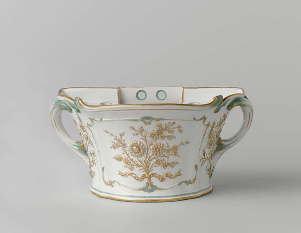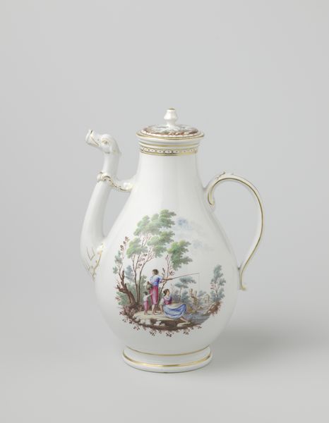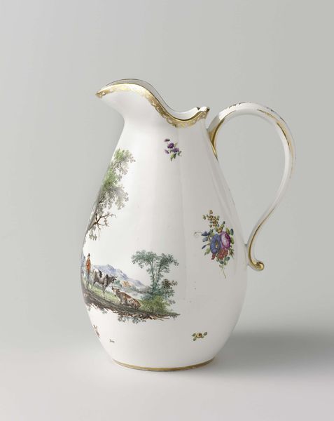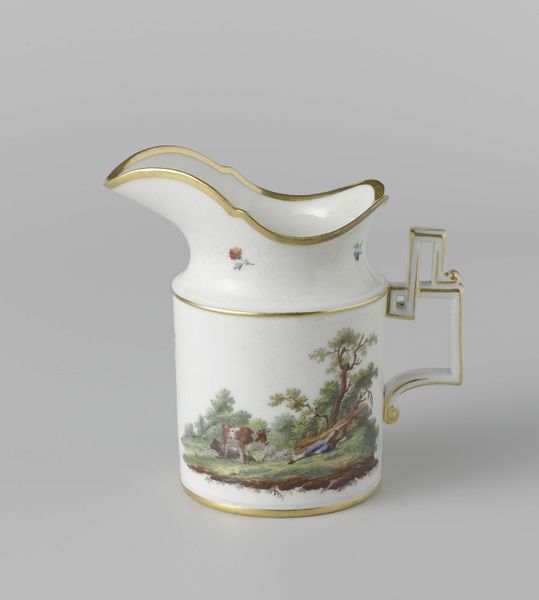 This elegant milk jug was created by Koninklijke Porseleinfabriek Dommer & Co. It is part of a wider tea service. The jug's refined decoration provides an insight into the aesthetic and social values of its time. Made in the Netherlands, it reflects the Dutch fascination with nature, seen in the delicate landscape scenes. The gold trim and elegant shape speak to a culture of refinement, where tea drinking was a ritual and a display of social status. The jug may seem like a simple object, but it carries cultural information. The tea service to which it belongs would likely have been used by wealthy families to imitate royal customs, connecting the rituals of tea with the performance of status. As art historians, we use objects like these to explore not only artistic skill but also the social norms of the past. By studying designs, materials, and the historical context, we gain insight into the values and tastes of the people who used them.
