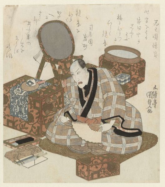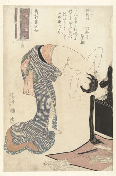 Editor: This is "Pop en kistje" by Shozo Ittei, a woodblock print from around 1820 to 1830. The figure's reclining pose, coupled with the patterned backdrop, gives it such an intimate feel. What catches your eye when you look at it? Curator: I see a deliberate construction of desire within a rigid social structure. This piece belongs to the ukiyo-e tradition, reflecting the "floating world" of pleasure districts. Consider how the artist presents the female figure; is she empowered or objectified by her nudity and surroundings, knowing that this piece was designed for the consumption of male audiences? Editor: I hadn't thought about that perspective. It’s interesting how what might appear as a simple, intimate scene can be viewed through a critical lens. How was something like this displayed at the time? Curator: These prints were mass-produced and circulated widely, a form of popular culture. Think about how they were collected, displayed in private spaces, and how they participated in shaping ideas about beauty, sexuality, and social status. Does knowing this shift your initial reading of the work? Editor: It certainly complicates it. It feels less innocent and more like a reflection of a male-dominated society. Curator: Precisely. And that tension, that play between the artistic and the social, is where the power of historical analysis lies. What about the textual elements – do they have a bearing in how one reads this visual representation? Editor: I would imagine so, because its inclusion means it was very much intended to inform the reading of the artwork! It's amazing how much history can be packed into a single image. Curator: Exactly! It’s a window into the past, prompting us to consider the complexities of representation and spectatorship.