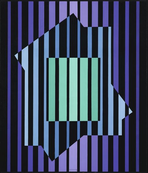 Victor Vasarely made this painting, Yanina-C, with geometric forms and flat colors. It looks like everything has been really carefully planned out. I wonder how much he allowed himself to change things as he went along. I love the way the colors create a push and pull. The greens and blues are cool, but they really pop against the purple. There's a real sense of depth, even though it's all on a flat surface. Look at the way the lines intersect and overlap. Do you see how the yellow stripes make your eyes move up and down? It is like a rhythm. The shapes and colors feel very precise and modern. It reminds me a little of Mondrian, but with a more playful, space-age vibe. I love how it invites you to get lost in its visual puzzle. Is it a pattern, a picture, or something in between? Art is such a conversation across time.