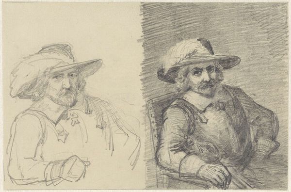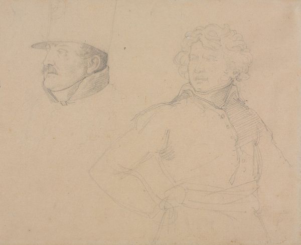 Editor: This is "Four Studies of a Priest," a pencil drawing made around 1846 by Wilhelm Marstrand. There's a real sense of character in each of these sketches. What stands out to you? Curator: Well, I’m immediately drawn to the hats. Each is distinct, aren’t they? Almost like symbols themselves, declaring something about the wearer's role or perhaps even his inner state. Consider how head coverings often denote status or belonging. What do these hats evoke for you? Editor: That's fascinating. I hadn't thought of them as symbolic in that way, more as practical attire. The large, almost floppy hat on the man in the top right almost feels comical. Is that intentional, do you think? Curator: Perhaps not comical in intention, but consider the "fool's cap," and the hat's association with knowledge – or a parody of it. Then there's the priest, busy writing in his peculiar outfit. What are they writing, do you think? About their faith, their community? And does the way they obscure themselves—those dark, deep shadows under their brim—say anything about knowledge as concealment, as well as illumination? Editor: That's a very intriguing reading. I hadn't considered the potential darkness or secrecy connected with them. Curator: It invites us to consider, doesn't it, how representation can reveal and conceal simultaneously. The marks of the pencil, too – the quickness of the hand, the shading. Are these portraits of particular people, or character studies – the priest as a type, an idea? What lingers with you now, after looking at these images? Editor: I appreciate the different levels on which you read the symbolism. Now I see the drawings more as social commentary. Curator: Precisely! And perhaps Marstrand hoped that these figures could embody aspects of Danish society at the time, and encourage its understanding.