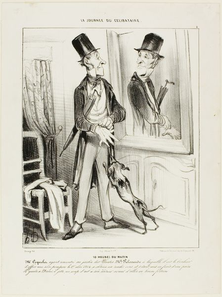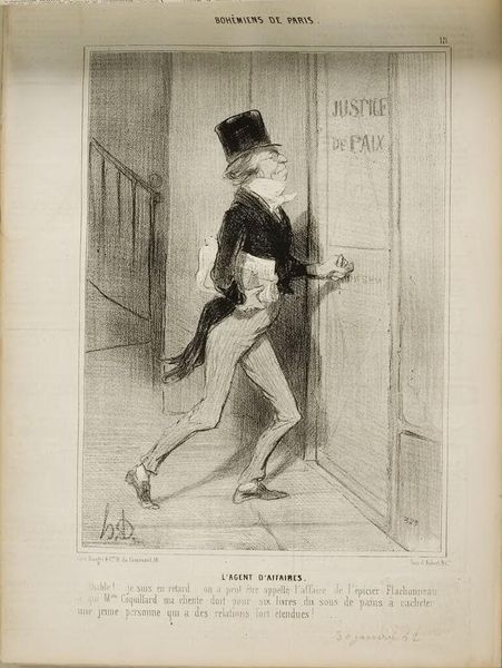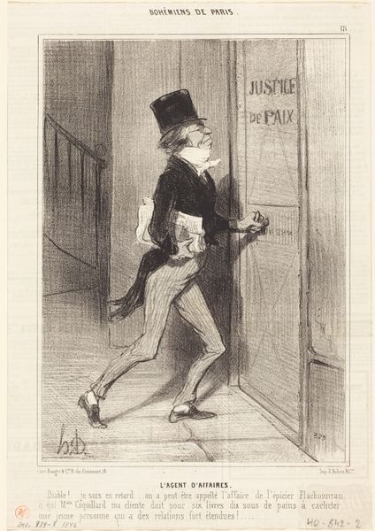 Curator: This is "Ciel!...je trouve ma femme déménagée!" by Honoré Daumier, created around the 19th century. It’s a lithograph, with pen and ink, categorized within Daumier's work on 'Moers Conjugales' a broader observation of marriage during this period. Editor: Oh, the poor man's face! That’s a "Oh dear" face if I've ever seen one! There's something so desolate about that overturned chair too—almost slapstick, but then not at all. A poignant visual. Curator: Exactly! The genius of Daumier is his ability to capture the socio-political climate in genre scenes and caricature. The crumbling ideals within marriage became fair game in public and popular culture in France at the time. The "Moers Conjugales" really did reveal just how complicated marriage could be! Editor: It’s remarkable how this drawing, even with its slightly absurd situation – coming home to find your wife has upped and left – tugs at something universal. Is he feeling abandonment or something deeper? Maybe the social expectation crumbling before him? I can almost feel the hollowness echoing through that empty doorway. Curator: These images were distributed to a broad public through newspapers. They functioned not just as light entertainment, but really started conversations in the cafes and homes of Parisians at the time. I imagine this scenario might have reflected something many people actually faced! Editor: Absolutely, this print's charm lies in its universality and honesty, rather than being overtly political. In that single lithograph, you grasp how domestic upheaval feels, that sense of loneliness. It serves as a timeless piece about change and acceptance. I think, with time, we can feel okay about his wife leaving! Curator: And perhaps that is what gives the image its resilience after all this time, that people relate. What Daumier really captured in this image speaks not to that individual alone, but rather everyone when facing unwanted personal shifts. It resonates beyond the socio-political history of marriage! Editor: It's about more than just a changed lock and some missing furniture; it's an internal move we’ve all had to make! Thanks for the background. It’s shifted the image from the personal to shared—which, for a solitary scene, feels just right.
