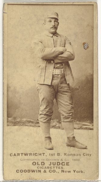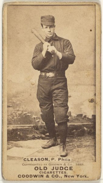 This is a card made by Goodwin & Company around 1888, part of their "Old Judge" series, printed using photographic methods on paper. Consider how the mass production of images, like this baseball card, was tied to the rise of both consumer culture and the sports industry. Photography allowed for the relatively quick and inexpensive reproduction of images, making it possible to create collectible cards inserted into cigarette packs, like this one promoting "Old Judge" cigarettes. The image itself, though seemingly simple, speaks volumes about the cultural values of the time. The careful composition, the subject's pose, and the way the photograph captures detail all contribute to the card's appeal as a collectible item. The printing is a skilled process with different stages from initial picture to final print. The image's existence as part of a larger marketing strategy underscores the entanglement of art, industry, and popular culture, and also, of course, the impact of the tobacco industry. This small card offers a glimpse into the intersection of labor, leisure, and commerce in a rapidly changing society.