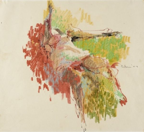Editor: So this is Egon Schiele’s "Seated Male Nude," from 1910, oil on canvas. The figure’s limbs are angular and the flesh tones are almost sickly, but I’m struck by how carefully his posture is constructed – almost like a distorted dancer. What do you make of its composition? Curator: The formal arrangement certainly commands attention. Observe how Schiele employs sharp, broken lines to define the figure, foregoing traditional modeling for an emphasis on angularity. Note the restricted palette, predominantly yellows and browns, punctuated by the almost lurid red accents. What effect do you think that contrast achieves? Editor: It almost feels…urgent? Like the red draws your eye and amplifies the overall unease. Does that play into Expressionism's focus on raw emotion? Curator: Precisely. Consider the pose itself – a seated figure, yet imbued with a palpable tension, a disquiet that resists any comfortable reading of repose. Observe the negative space surrounding the figure. How does this emptiness contribute to the overall feeling? Editor: I guess the emptiness intensifies the isolation. The figure becomes almost fragile against such a vast background. Curator: Precisely. Furthermore, Schiele uses line to define both form and emotional state. The deliberately awkward positioning, the visible ribs, all contribute to an almost visceral depiction. There is an undeniable confrontation in this image, one generated solely from the interplay of formal elements. Editor: I hadn't considered how much the formal choices contribute to the emotional impact. Seeing it broken down like this clarifies so much. Curator: Indeed. The work challenges us to decode not merely what is depicted, but how it is depicted, revealing layers of meaning within the very structure of the painting itself.