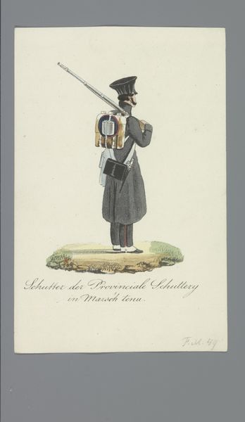 Curator: So, here we have Albertus Verhoesen’s “Muzikant der Schutterij,” dating from sometime between 1835 and 1850. It's a watercolor drawing currently residing in the Rijksmuseum. Editor: Oh, wow! The lonely musician... I immediately get this wistful vibe, almost theatrical in a quaint, charming sort of way. Curator: Quaint indeed! These Schutterijen, or civic guard, were very much a part of the social and political landscape of the Netherlands. Think of them as a citizen militia—symbols of local pride, but also of a very specific, often exclusive, societal structure. Editor: It’s amazing how much that context shifts my perspective. He seemed so... melancholy at first glance, just standing on that tiny island of grassy colour. Curator: Consider his uniform—the meticulous details point to the rigid rules governing membership. Who was included, and perhaps more importantly, who was excluded from this civic body? Class, religion, social standing—these were all critical factors. And this costume as part of the militarization and the performativity of citizenship... Editor: Yeah! I’m seeing it. And, in that way, I realize I want to know so much more about his instrument: What kind of tunes would he play? Who was listening? Did the music celebrate shared values or drown out dissent? So much weight in that single note... or a presumptive note anyway. I can't hear anything looking at this now, but wish I could! Curator: Exactly! And that, I think, is the real power of a piece like this, to make us aware of the complex social arrangements reflected through cultural and visual languages. Editor: It’s transformed from being simply a 'nice watercolour' into a really incisive visual essay about the history. That's what great art does, doesn’t it? I will always have such respect for history paintings, especially now that I understand the cultural impact they can carry. Curator: Well, hopefully you’ll take away from this quick glance, a slightly more nuanced way of seeing the relationship between society, identity and art. Editor: Always!