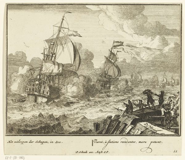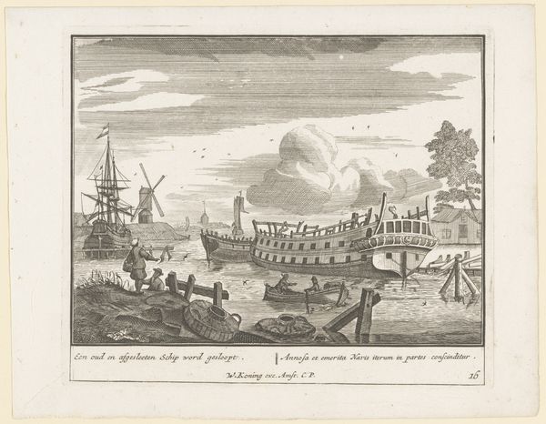 Editor: Here we have Pieter van den Berge's engraving, "Te water laten van een schip," made sometime between 1717 and 1732. The detail is amazing, especially capturing the hustle and bustle around the ship launch. It really makes me wonder what this event meant to the people depicted. What do you see in this piece beyond the surface representation? Curator: It’s a fascinating image, isn't it? I see more than just a ship launch. Look closely – how does the artist position this event within the broader context of Dutch society at the time? The Dutch Golden Age was built on maritime power and global trade. What statements do you think this engraving makes about the relationship between Dutch national identity, labor, and economic expansionism? Editor: That's interesting. So you're saying it's not just a historical record, but also a commentary on the socio-economic forces at play? Curator: Precisely! Consider how labor is depicted. Who is visibly working, and who is observing? Who benefits directly from this launch? I also notice that there are buildings surrounding the scene and a flag being raised. How might those details affect the experience of different groups within Dutch society and maybe other communities that engaged with Dutch merchants? Editor: So it’s about access, or rather, who doesn't have it. By focusing on who's at work and who is observing, the artist points to the social inequalities inherent in this economic activity. That's really made me reconsider the flag waving so proudly and to think more critically about its symbolic messaging. Curator: Exactly! It prompts us to question whose narratives are privileged in historical depictions like these. The piece really encourages critical engagement with historical images and a deconstruction of assumed meanings. Editor: That is quite an insight. Now I'm looking at it from an entirely new perspective! Curator: Hopefully, you can always appreciate any artwork’s interplay of history, culture, and identity.