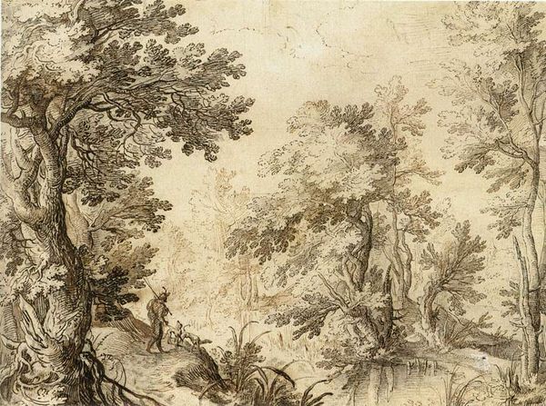 Curator: This is Gillis van Coninxloo's "Forest Scene with Hunters," painted around 1600, executed in oil. The painting, residing here at the Städel Museum, presents an idyllic, almost primordial vision of nature. Editor: It strikes me immediately as rather imposing. There’s a kind of brooding intensity, stemming from the limited palette of greens and browns, offset by the ethereal, almost otherworldly distant landscape. The density of the forest almost feels claustrophobic, doesn't it? Curator: Precisely. Coninxloo employs a sophisticated compositional technique here. The close attention to detail, particularly in the rendering of individual leaves and branches, creates a densely packed foreground, which gradually gives way to a more loosely defined background. This contrast generates depth, drawing the viewer’s eye into the heart of the forest. Editor: Beyond the landscape itself, it is impossible not to notice the hunters strategically placed at different distances within the woods. They function symbolically, embodying the themes of dominance, skill and our intrinsic relationship to nature. This painting also reveals period notions of game, of survival, and the hunt as social ritual. Curator: A point well-made. Also crucial is Coninxloo's application of light. See how light permeates the canopy and subtly illuminates specific areas? It gives texture to the piece. The subtle variations create a sense of movement. This dynamic play, coupled with the rich coloration, accentuates the structural balance of the composition. Editor: Light can of course be interpreted differently – here, in conjunction with the placement of figures in this dense forest, I believe there is a very strong hint of humankind as something small, in a landscape much bigger and beyond its control, especially considering the Baroque interest in landscape as allegory. Curator: It is through a nuanced reading of form and arrangement that we understand Coninxloo's technical mastery and deliberate attempt to reconcile structure with emotion. Editor: Indeed. Seeing the landscape anew reminds me of the enduring power of symbols embedded within art to communicate cultural and individual experience across centuries.