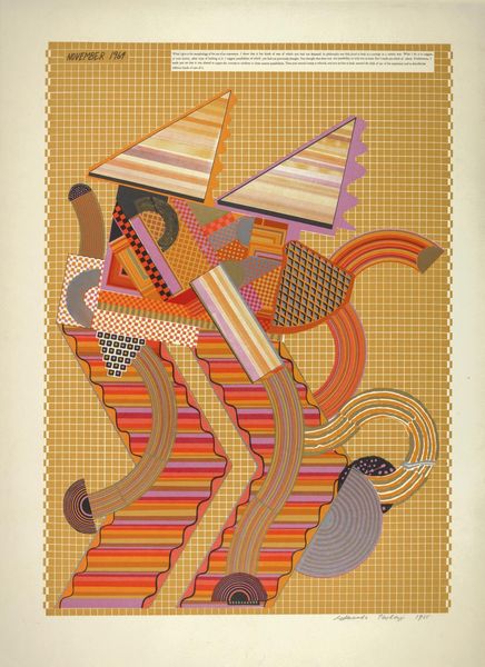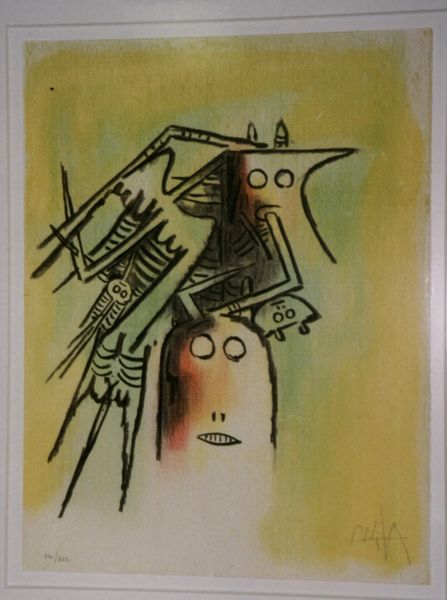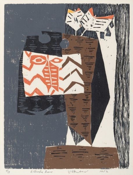 Editor: We're looking at "Friends of the Mountain," a 1956 woodcut print by Tadashi Nakayama. The simplified geometric shapes and limited palette create such a striking and slightly odd composition. What do you make of this, focusing on the formal aspects? Curator: Formally, it is quite engaging. Consider the use of line: bold, confident, defining each plane of color. There's a strategic contrast between the figure rendered in geometric abstraction, and the comparatively softer lines of the bird. Does this tension alter your initial impressions of the artwork's mood? Editor: Yes, that is true. The figure almost feels deconstructed, yet stable due to those very defined lines. The bird seems more fragile, its curved shape softening the piece. But why is the figure constructed using blocks? Curator: Note the tension and structural elements between color and form. The blocks can be viewed as an intentional attempt to flatten the image. This reduces any sense of traditional perspective. What purpose do you think that serves for the viewer? Editor: It almost forces you to confront each shape, each color, individually and then as a whole, to piece together the figure yourself. It's less passive viewing, more active construction of meaning. Curator: Precisely. Nakayama employs the woodcut medium masterfully, celebrating the inherent qualities of the medium with bold colours and emphasizing the textures through deliberate cuts. Considering the use of form, do you agree the artist creates a structured aesthetic experience for the observer? Editor: Absolutely, reflecting on your insights regarding structure, color, and line, I now see that the abstraction steers me to see the geometric as building blocks. It shows an abstract interpretation through clear, defined form. Thanks, I missed so much initially! Curator: Indeed. Engaging with the formal elements allows us to see how visual aspects work together to form meaningful interpretation.