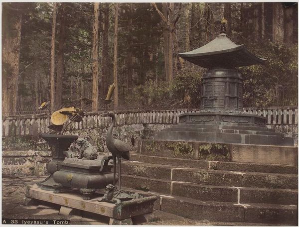 Editor: Here we have Suzuki Shin'ichi's photograph of the Buddha sculpture from the 1870s, housed at The Met. It's truly impressive, though its realism, paradoxically, renders the sculpture almost lifeless, what with the tourists casually placed on it and nearby! What is your take on it? Curator: Well, let's look closely at the materials and process here. It's a photograph *of* a bronze sculpture, taken during a period of intense Western influence in Japan. Notice how the photographic process, inherently industrial and replicable, intersects with a traditional religious image. It raises questions about labor, doesn’t it? Editor: It does! How so? Curator: Consider the labor involved in creating the original sculpture - the mining, smelting, casting, the artistry… all intensive and communal work that accrued spiritual merit. Then, flash forward: photography as an emerging medium is, though artistic, of an industrialized form; also enabling mass consumption of this Buddhist imagery. We must consider how that labor and purpose contrasts. Editor: I see your point. So, you’re saying the photograph, as a commodity itself, transforms the spiritual essence of the sculpture, turning it into an object of orientalist consumption? Curator: Exactly! The very act of capturing and disseminating this image democratizes it, shifting it from a sacred object rooted in ritualized labor to a product circulating within a burgeoning global marketplace for exotic imagery. Think about who commissioned and consumed these photographs and why. Editor: That really changes my perspective! I hadn't considered how the act of photographing and circulating it contributes to a shift in its cultural function. Thanks! Curator: It’s fascinating to see how material transformations reflect and shape broader social and economic shifts. The layering here is remarkable!