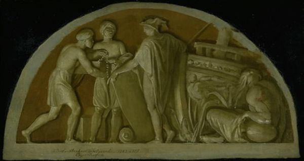 Editor: This is a marble relief from 1785, titled "The Dutch Colonel Henry Drevon, Dressed as a Roman Field Marshal," by C.F. Stanley. There's a palpable sense of... stoicism here. How do you interpret this work? Curator: Immediately, I see a deliberate engagement with power, identity, and representation within the late 18th century. We're not just looking at a portrait, but a carefully constructed performance of masculinity and authority. Notice the Roman garb, the sword, the architectural elements… These are all signifiers, deployed to connect Drevon to a lineage of power and military might. What does it tell us about the colonial project of the Dutch, seeking legitimization through an appeal to Roman antiquity? Editor: So, the classical imagery is almost like a costume – a way to borrow authority? Curator: Precisely. Neoclassicism itself was a powerful aesthetic tied to revolution, but also empires. It's fascinating how it could be used to represent ideals of civic virtue, but also to cloak colonial ambitions. The text, while partially obscured by the marble, also gives us another layer to understand how power, and by extension happiness, is perceived. And the positioning within a pastoral setting almost signals an appropriation of the land; doesn’t it? Editor: That’s fascinating; I hadn't considered the colonial aspect so directly. I was initially focused on the figure itself, but framing it within that context makes it so much richer. Curator: The real power of art history lies in these contextualizations. It's about peeling back the layers of meaning and recognizing the complex historical and social forces at play. It changes the way you see the work.