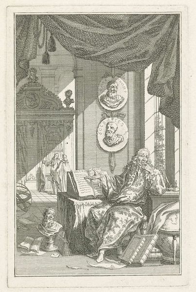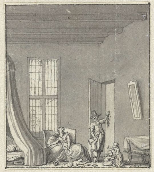 Curator: Looking at "Januari", an engraving made by Simon Fokke sometime between 1722 and 1784. It is currently held here at the Rijksmuseum. What is your first take? Editor: Stark! I’m struck by the intense crosshatching and its effect on the eye. The entire scene is so carefully rendered but, perhaps intentionally, feels kind of claustrophobic. A darkness enshrouds the space, relieved only by the outdoor scene viewed in the opening, where people chop wood. Curator: The genre scene of daily life that Fokke has portrayed would certainly resonate with the rising merchant class, but if you examine other works produced during the era you begin to notice the common anxieties about class status. Editor: Absolutely. The activities outside stand in sharp contrast to the domestic scene inside, really underscoring the distinct labors tied to separate social strata. There is a clear juxtaposition of nature and domesticity, further stratified by class and economic differences. The people cutting wood and working in the yard support those inside this building; perhaps they even are a single economic unit working and coexisting together. I do find the inclusion of dogs’ heads at the subjects' feet particularly striking— Curator: Dogs' heads? Now that's intriguing! Fokke’s choice to depict these images may be a symbolic representation of labor division in society, offering a look into Dutch society at that point in history, where an engraver captured domestic scenes during an era defined by shifting social structures, urbanization, and class distinctions. This type of interior-setting and image-building reinforced cultural notions of class. Editor: Yes! You see how deeply entwined individual experience and social structures were—gender and economic station played roles that reinforced those hierarchies. I also love thinking about art's agency within political discourse—these detailed images would surely prompt both reflection and, sometimes, conflict. Curator: Indeed. Fokke’s prints are not just decorative; they served as vital documents through which we could start exploring issues of representation, social identity, and collective experience. It offers an opening into the lives of 18th-century Dutch society. Editor: Well, exploring this engraving reminds us of art’s amazing capacity to give a framework, where each artistic decision serves as both window and mirror, illuminating not just a period in history but ourselves.