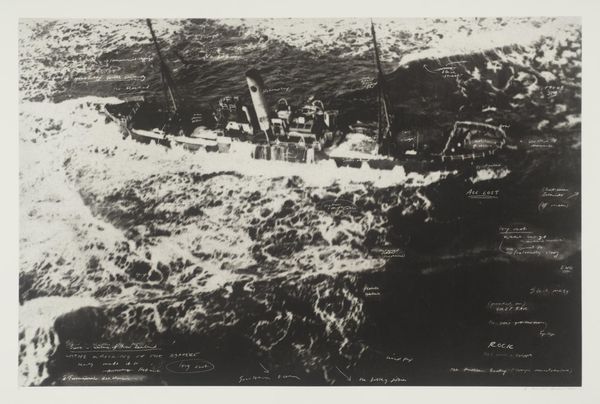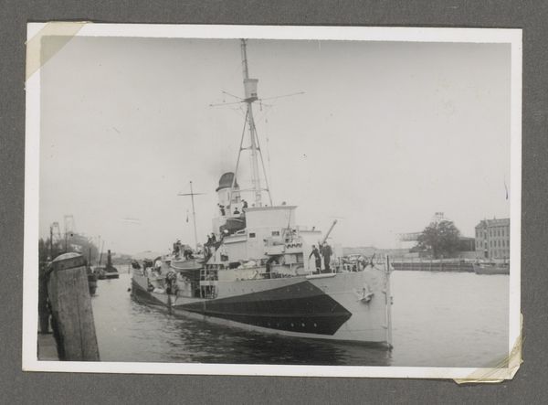 Curator: "U.S.S. Columbia Under Construction," created in 1945 by John Taylor Arms. It’s a print made through etching and engraving techniques. What's your take as you gaze upon this meticulous scene? Editor: The initial impression is overwhelming industry—a mechanical ballet of production. Look at the battleship's imposing bow; its form dominates the frame with a weighty silence that hangs over the landscape. Curator: The landscape style employed really strikes me, though. One doesn't normally consider a warship 'landscape,' but look how the cranes frame the scene, how the sky almost blends into the industrial haze. Arms found a certain beauty in this machinery of war, I feel. Editor: Beauty born of labor, absolutely. But I see this as an almost brutal representation of materiality. Consider the sheer amount of material extracted, formed, and assembled here; it's a monument to mass production and wartime economies. It speaks volumes about the cultural moment. Curator: Perhaps... but look closer at the intricate detailing of the etching. The delicacy with which he renders the rigging, the way light glints off the metal… It’s almost devotional, a painstaking appreciation of craftsmanship. A melancholic one at that, as war was reaching its end. Editor: The etching and engraving draw attention to their own means—the very texture, the almost repetitive lines on the battleship draw you into the materiality of it all, away from, say, a traditional painting style. You sense the intense labor etched into its surface. Curator: I feel like the work transcends mere propaganda, or documentary. The artistry lies in finding a spiritual resonance amidst this… this beast of industry. It invites reflection beyond its immediate context. Almost makes you ponder progress. Editor: Progress at what cost, though? It asks you to reflect not just on artistic labor, but on all the invisible labor behind it. The unseen hands, extracted materials. So many layers—the etching and engraving but one. Curator: An excellent point. It really captures that tension between artistry and industry so prevalent during that era. Editor: Precisely! Now I have a deeper appreciation for the artistic layers alongside the more obvious display of industrial process. Thanks for a nuanced insight.