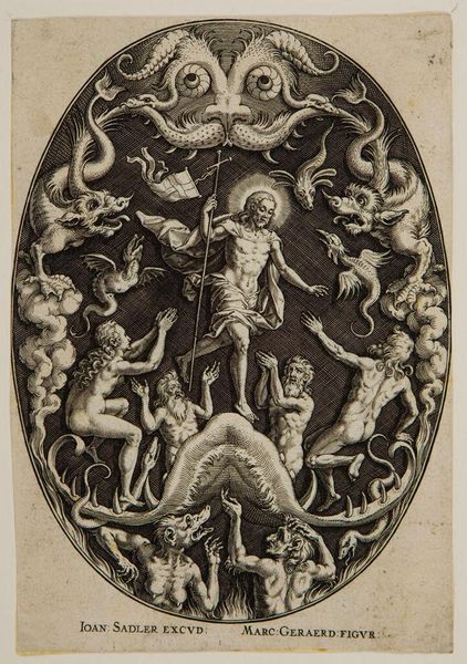 Curator: What a composition! The eye dances across the surface, from the central figure to the grotesque ornamentation. Editor: This is Johann Sadeler I's "Flagellation," an engraving illustrating the biblical scene. Its display here reflects the evolving cultural interest in religious narratives during the late 16th century. Curator: The stark contrast between light and shadow definitely intensifies the scene's drama. The artist uses such detailed hatching to create depth and texture. Editor: Absolutely, and it's worth noting how such images circulated widely, often shaping popular understanding of religious events and reinforcing socio-political power structures. Curator: For me, the decorative elements, like the mythical creatures, overshadow the supposed subject. The artist is more invested in surface appeal than spiritual depth. Editor: Yet, perhaps those grotesque masks reveal the darker aspects of human nature that allow such violence to occur. It mirrors the society of the time. It's a piece that sparks contemplation. Curator: A dizzying display of skill, whether it inspires or unsettles is in the eye of the beholder.