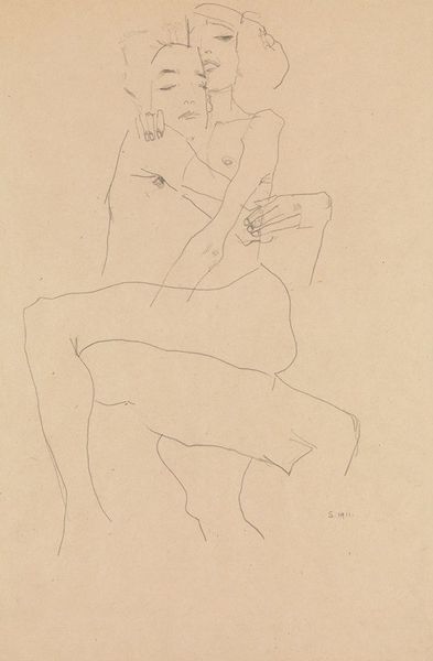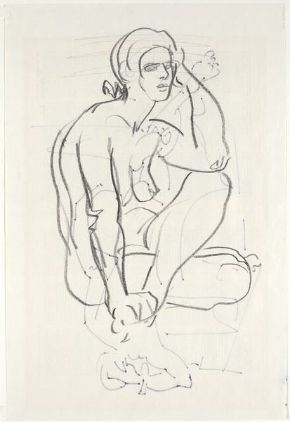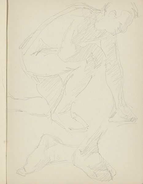 Curator: This work, entitled "Man die een voorwerp vasthoudt en bestudeert," which translates to "Man Holding and Examining an Object," is a pencil drawing on paper, made around 1930 by Carel Adolph Lion Cachet. What strikes you first about it? Editor: The economy of line! It’s incredibly sparse, almost tentative, yet it manages to convey so much with so little. You can almost feel the rough texture of the paper and the softness of the pencil lead. Curator: Indeed. Cachet was known for his involvement in the Dutch Arts and Crafts movement. This drawing resonates with the values of that movement, highlighting the artistry in everyday subjects and the beauty in simplicity. We need to look at the society, with the industrial revolutions and the position of crafts in them to truly grasp the sentiment. Editor: Exactly! And notice how the focus isn't necessarily on the man's face or expression, but rather on the object he's holding. It encourages us to consider what is the significance of such daily interactions. It looks to me like the production value would be next to nothing, but is there a real artistic value? Curator: It reminds us that the act of observation and engagement with the material world is worthy of attention, a common modernist theme. He's studying this piece, possibly a craft object himself and in his moment there is deep contemplation. Editor: The simplicity also points to function. Was this part of the conceptualizing for something grander? Curator: It certainly could have been! As a designer and artist, Cachet was deeply engaged with both the aesthetic and the practical aspects of design. Editor: It seems almost unfinished, doesn’t it? Curator: Perhaps deliberately so. The lack of detail draws attention to the fundamental elements of form and line, emphasizing the act of drawing itself. Furthermore, it shows that art need not always follow some stuffy rule, in order to have meaning. Editor: Absolutely, that really changed my first impressions. It made me look closer and notice the man. Curator: Well, it's a reminder that beauty and significance can be found in the most unassuming places. Editor: Indeed. And through focusing on the basic process, labor, material, and that very human act, it gains considerable significance.