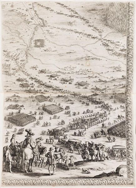 Editor: Here we have Jacques Callot's "La Revue," an etching. It depicts a military gathering and feels incredibly detailed, almost like a bird's-eye view. What strikes you about this piece? Curator: This print offers a glimpse into 17th-century militarism, but through whose eyes are we seeing it? Callot's meticulous detail normalizes the spectacle of power. Consider how the print may sanitize or even glorify military strength, obscuring the realities of conflict and its impact on marginalized communities. How does the composition influence your reading? Editor: I hadn't thought about it that way. The orderliness definitely seemed celebratory, but maybe there's a critique hidden within the detail. Curator: Precisely. Art often speaks in layers.