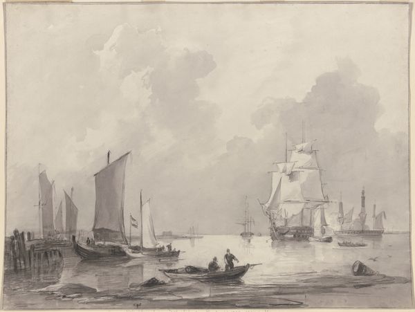 Editor: Here we have Martinus Schouman's "Ships on a Calm Sea," likely created after 1790. It’s a drawing rendered in pencil, chalk, and ink. I’m struck by its stillness; the soft greyscale palette really contributes to this tranquil mood. How do you interpret this work? Curator: The calmness you perceive reflects a very particular vision of maritime power and trade. Look closely at the ships; their size and number were potent symbols of Dutch commercial dominance at the time. Note, for instance, how the massive ships loom in the background as symbols of economic and political power, overshadowing the men in the smaller boat. Do you notice that? Editor: I see it now. It's almost like they're dwarfed by the ships, maybe representing their reliance on them. Curator: Precisely. Schouman uses these vessels almost as characters. They carry collective hopes, fears, and anxieties about overseas ventures. Consider also the single shark fin visible on the far right – does that contribute to the idea of a ‘calm sea?' Editor: That’s a good point! I suppose that small element of danger hints at the risks associated with maritime life, despite the tranquil surface. Curator: It underscores the constant negotiation between prosperity and peril inherent to seafaring and Dutch national identity during that period. This is how Schouman captures both. Editor: I see how the symbolism brings a lot of depth to what seems like a straightforward scene. Curator: Indeed, by understanding how these symbols worked together, we can start to see how this deceptively tranquil work shows us the emotional landscape tied to the era. Editor: Thank you for drawing out the multiple layers! It is very helpful.