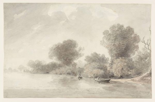 Curator: Today we’re looking at a drawing by Hendrik Huygens called "Fort Zeelandia gezien bij het opvaren van de rivier Suriname," made before 1859. Editor: It feels…oppressive. The sky is heavy, mirroring the dense foliage. There’s a stillness that speaks of humidity and unspoken tension. Curator: The composition is quite balanced, wouldn’t you agree? Huygens uses the river as a strong horizontal axis, anchoring the fort and ships. Notice the use of light and shadow to create depth. The linear perspective leads the eye towards the horizon, while the varying textures give it a tangible quality. Editor: Tangible indeed, but for whom? I'm thinking about the forced labor and resource extraction that underpinned the colonial project Huygens so calmly depicts. The ships, the fort – they symbolize power structures that directly benefited some while violently exploiting others. It’s difficult to look past that history when assessing a landscape like this. Curator: I understand your perspective. However, looking closely, the rendering of light on water, for example, can be read purely for its skillful depiction of luminosity. We might examine how the artist’s specific choices of line weight contribute to the overall harmony. Editor: But "harmony" is a loaded term when discussing colonial landscapes. Is harmony possible when its creation relies on violence? Shouldn’t we consider how these serene images functioned to legitimize colonial power? It normalizes what was anything but. Curator: Perhaps both readings are possible. One doesn't negate the other. It shows a rendering technique and the grim history from where it came. Editor: True, maybe recognizing that tension is what makes engaging with this drawing worthwhile. To reflect on our perception, too, is crucial. Curator: I think it’s important to reflect not only on where we come from but on where our readings might come from. It goes in both directions and gives meaning in return. Editor: Exactly, now that I look at it differently, its muted tones subtly convey the heavy weight of history and I agree it balances out the aesthetic nature with harsh truths.