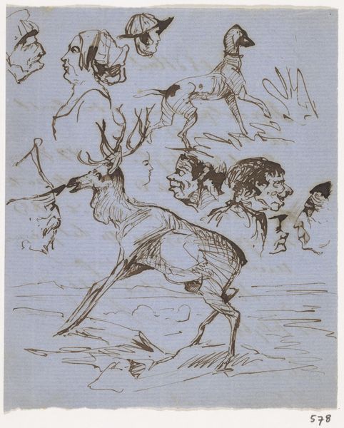 Curator: So, here we have Johannes Tavenraat's "Schetsblad," a sketch sheet dating from 1840 to 1880. It’s currently held at the Rijksmuseum. What strikes you about it? Editor: It’s intriguing how the figures – the gentlemen, the child, the dog, even the deer – are rendered so quickly, almost fleetingly, in pencil on paper. It feels very immediate, like a snapshot. How do you interpret this work? Curator: I see a fascinating glimpse into the production of art in the 19th century. This isn’t a finished painting destined for a salon. It’s raw, it’s process. Look at the material reality: inexpensive paper, a simple pencil. It speaks volumes about accessibility and the everyday practice of artistic observation. Where did Tavenraat source these materials? How readily were they available? These questions are crucial to understanding the broader artistic ecosystem. Editor: I hadn't considered the materials in that light. The sketch-like quality made me focus on the figures themselves. Curator: Exactly! Consider the labor involved, too. Was this a commissioned study? Or personal practice? Even the *choice* of depicting these figures—genre painting suggests a certain social interest. Are these the emerging middle class taking leisure in the countryside, for example? And look at the dog: it could suggest hunting as a commercial means to survive and feed one's family, maybe it is not a friendly family pet. How do these details inform the narratives being crafted around art and class during this era? Editor: So, you’re seeing this sketch sheet not just as a preparatory study, but as a document of the artist’s labor and the materials he used? Curator: Precisely. The seemingly mundane materials and the act of sketching itself are revealing of the broader economic and social realities that shaped artistic creation. It transcends the purely aesthetic appreciation and dives into the material conditions of artistic production. Editor: I'll never look at a sketch the same way again. Thanks for showing me the materials, means, and cultural references in this work! Curator: Indeed. It is just more to add to our arsenal in interpreting all forms of art from different backgrounds, perspectives and social viewpoints.