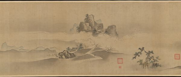 Editor: Here we have Ye Xin's "Snowscape, leaf from Album for Zhou Lianggong," created between 1645 and 1655 using ink and watercolor on paper. It has such a desolate and quiet mood. What do you see in this piece, particularly beyond the immediate landscape? Curator: Beyond the aesthetic beauty, it's important to contextualize this work within the sociopolitical turmoil of the late Ming dynasty. Artists like Ye Xin were often grappling with themes of retreat and resistance in the face of political upheaval. Consider the very act of painting a snowscape – what does the symbolism of a purified, frozen landscape communicate about the artist’s potential disillusionment with society or a longing for an idealized past? Editor: So, it’s less about just the pretty scene and more about the deeper implications. The snow, then, could be seen as a kind of... cleansing? Curator: Precisely. And what about the composition itself? Notice the contrast between the detailed foreground and the hazy background. Could this signify a tension between the lived present and a longed-for future? Are there philosophical lineages we could investigate that this reminds you of? Editor: Hmm, I see what you mean! It does feel like a world in transition. Thinking about the future, this piece now makes me reflect on the ecological changes impacting similar landscapes today. Curator: Exactly. By interrogating these artworks through an intersectional lens, considering themes of power, identity, and environmental concerns, we uncover layers of meaning. The artist may or may not have directly intended this, but our reading is valid. Editor: I see that now. I hadn’t thought about connecting art with such broad, contemporary issues before. Thank you, that really expanded my understanding of the piece! Curator: And for me, reflecting on how our experiences impact our interpretation only enriches the conversation!