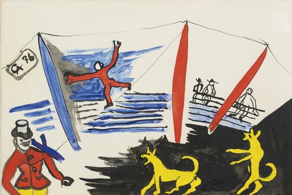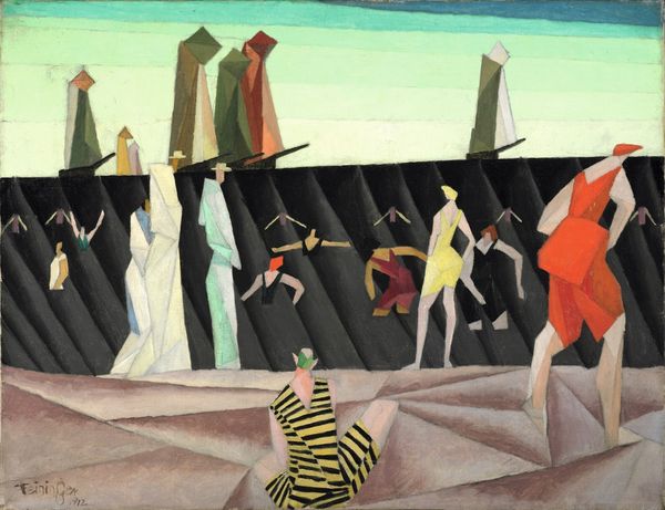 Curator: This is Benny Andrews' "Circle Study #11," created in 1972. It is an acrylic and collage on canvas. Editor: Well, my first thought is that it’s surreal! The figures are oddly proportioned, casting elongated shadows in a kind of desolate landscape, and the palette is quite muted. There is an isolated mood of quiet expectancy that reminds me of childhood games. Curator: Andrews often incorporated collage elements to bring texture and dimensionality into his work, disrupting the smooth surface of traditional painting. Consider how this emphasis on materiality intersects with the narrative he's presenting, which has strong elements of folk-art. Editor: Yes, I can see that. Look at the arrangement of figures around the central open space. The way their postures and expressions seem both celebratory and…subdued. There's a definite community dynamic here. It makes you wonder what event or social practice it depicts or what societal conditions impacted the making of the artwork. Curator: Andrews’ works often addressed themes of social justice and identity, deeply rooted in his experiences growing up in rural Georgia during the Civil Rights era. This painting style reminds me of work by naive or outsider artists of his period. Note the almost caricature-like representation of the people and how that choice might contribute to the painting's larger narrative. Editor: Right, the slightly awkward, almost clumsy renderings of the figures serve to humanize them. It adds a layer of vulnerability that undercuts any sense of grandiosity, or even, perfection, highlighting everyday experiences. So, perhaps we are seeing a localized, folk expression being elevated to high art. Curator: I think Andrews pushes back against the traditional canon by centering the experiences of marginalized communities and their visual cultures, thus questioning the politics of who and what gets represented. The artist’s position shapes our view, too. Editor: The painting evokes complex sentiments around rural community practices while subtly challenging traditional art paradigms, I noticed elements reminiscent of games that underscore everyday realities of Andrews’ setting and the people that occupied that realm.