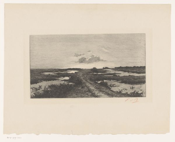 Editor: This is "Vesterhavet," or "The North Sea," an 1885 etching on paper by Niels Skovgaard, and it’s currently at the Statens Museum for Kunst. I'm immediately drawn to the textural contrast between the sky and the sea. How would you interpret this work? Curator: For me, it resonates with the visual weight carried by seascapes in Danish cultural memory. Skovgaard, like many artists of his time, engages with the Romantic idea of nature's sublime power. Editor: So, the vastness of the sea acting as a metaphor? Curator: Exactly. The sea is a recurring symbol in art, representing everything from the unconscious mind to the border between worlds. Think of the ship as a vessel carrying cultural values or individual destinies across that divide. Editor: I never considered the sea carrying that heavy cultural baggage before! Do you think the sun and clouds add another layer to that symbolic imagery? Curator: Definitely. Light, especially sunlight filtering through clouds, can symbolize hope, revelation, or divine presence. These visual elements create a narrative of the human relationship with nature – a quest for understanding or harmony with something immense and uncontrollable. Editor: That makes so much sense, now. I initially saw just a moody landscape, but I see how much richer it is now with those additional layers of symbolism. Curator: That's the beauty of delving into iconography! The more you recognize the visual vocabulary, the more deeply you understand the enduring human stories being told.