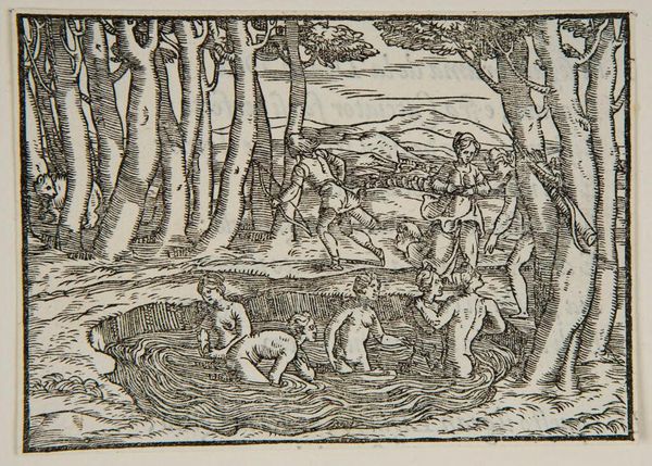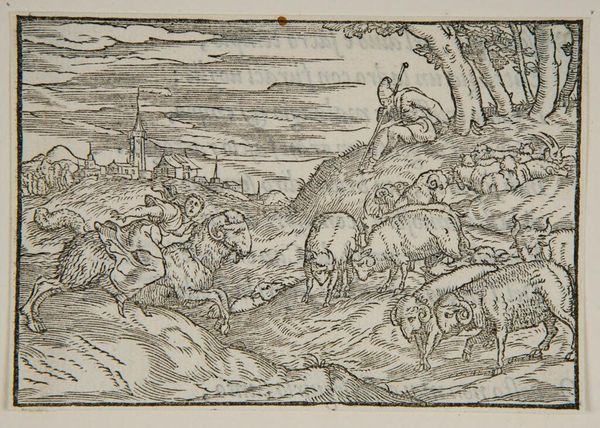 Curator: Here we have "Cut X", an anonymous woodcut print from the Harvard Art Museums. The scene depicts figures in an open landscape dominated by a large boar. What strikes you most about it? Editor: The chaos. The way the people are scrambling, the boar charging... it speaks to a societal anxiety, a lack of control, maybe even a fear of the wild encroaching upon civilization. Curator: Indeed. The boar itself, rendered with such bristling detail, embodies primal energy. Boars often symbolize courage and aggression, but also potential for destruction. Consider the visual weight it carries here. Editor: Exactly, and notice how the figures are positioned in relation to it—one already fallen, others fleeing. It reminds me of power imbalances we see reflected in contemporary power structures, where the vulnerable are left exposed. Curator: It’s an interesting parallel. In the visual language of the time, the boar might also serve as a symbol of base desires, or the untamed aspects of human nature itself. Editor: Perhaps. I still keep coming back to the broader social implications, how such imagery could reflect societal anxieties. Curator: It truly provides such interesting points for reflection. Editor: Absolutely, and it’s exciting how the narrative continues to resonate, even today.