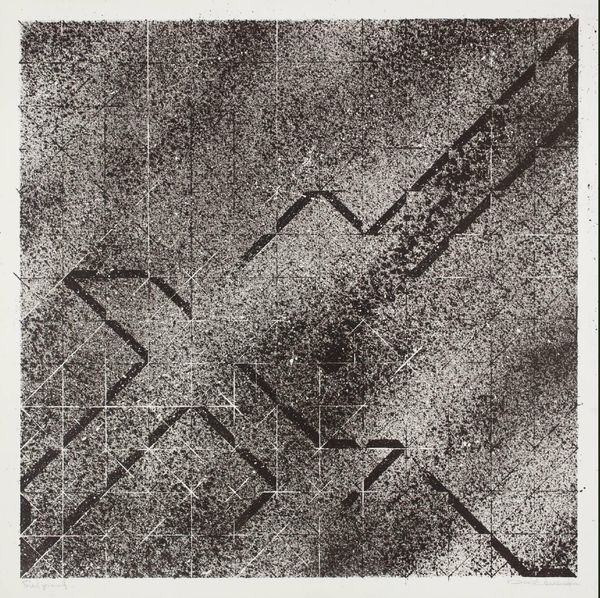 Curator: John Christie’s work, "Frankfurt Circle", presents a fascinating intersection of form and socio-political commentary. The print, part of the Tate collection, immediately strikes me as slightly unsettling with its jumbled geometric forms. Editor: The dynamism of the composition is undeniable; the floating, almost ethereal, geometric shapes create a tension within the stark black background, bisected by the firm red circle. Curator: Christie was deeply engaged with architectural and urban theory. This piece could be a commentary on the post-war rebuilding of Frankfurt, perhaps reflecting on the tensions between imposed structures and the lived experiences of its citizens. Editor: I see the shapes as self-contained studies in texture and light. The overlapping creates subtle gradations, transforming simple squares into luminous planes. Curator: Perhaps. But situating it within Christie's broader engagement with social space offers a richer reading. Editor: It's captivating either way. The way the artist balances simple shapes is beautiful. Curator: Indeed, it speaks to how geometric abstraction may not just be about the picture, but also about the world around it.