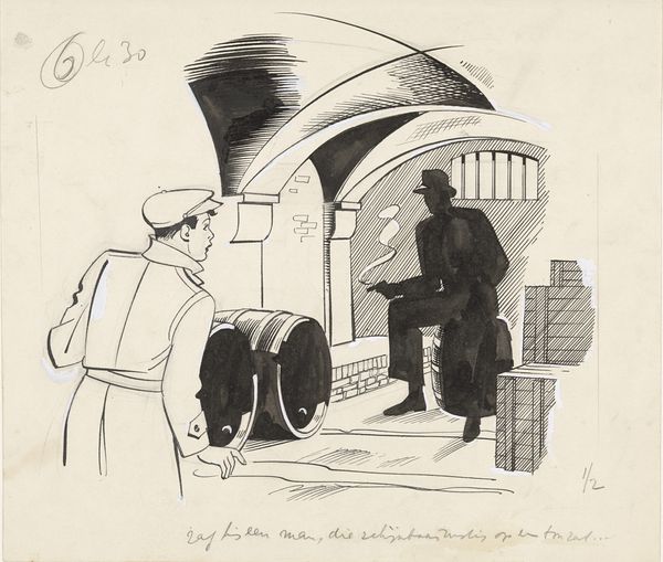 Editor: Here we have Sid Gotcliffe’s “Untitled (Departure),” created in 1942 using watercolor and coloured pencil. The scene depicts figures waiting at a train station. The muted colors give it a melancholy feel, but the slightly cubist style creates interesting spatial relationships. What do you see in this piece? Curator: Initially, one is drawn to the fracturing of space. Note how Gotcliffe avoids traditional perspective, opting instead for planes of colour to define the architecture of the station. Observe the flattened picture plane, enhanced by the deliberate, almost childlike, quality of line and form. What impact do you think this style has on our reading of the image? Editor: It feels like it’s both everywhere and nowhere at once. The slightly off-kilter perspective stops you from locking in to a definite location, perhaps enhancing the theme of transience? Curator: Precisely. The lack of detail in the figures, reducing them to geometric shapes and blocks of colour, could be seen as depersonalising them. They become archetypes, representing anyone and everyone facing departure. The limited palette also contributes to a subdued mood. The emphasis seems to be more on the formal arrangements rather than specific narrative. Editor: The lack of detail is certainly interesting, and does invite you to fill in the gaps as a viewer. It focuses you on the shapes and how they repeat through the painting, rather than individuals or any story. Curator: Exactly. And have you observed the relationship between the warm hues clustered towards the center and the cool tones dominating the lower register and upper left? Editor: Yes, I noticed the warmer tones draw you in and keep you centered on the people waiting, making that the main focus. Thank you, that formal analysis really clarifies how all of the choices Gotcliffe makes build that feeling of abstracted transience!