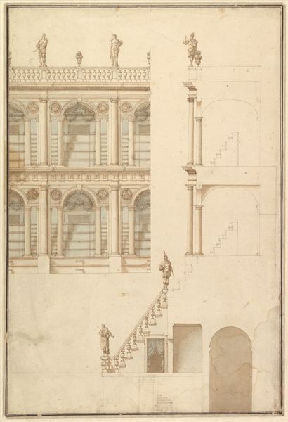 Nicolai Abildgaard made this drawing, 'Street in an Ancient City: Perspective Study for the Painting "Simo Confides in Sosia"', using pen and grey ink on paper. The linear perspective, anchoring the composition, directs our gaze down an implied street bordered by monumental, classical structures. The architectural forms are rendered with precision. Abildgaard has employed orthogonal lines receding to a vanishing point, creating a deep space. This method, while appearing to depict a real place, serves to construct a carefully ordered, idealized setting. The cool grey tones emphasize the structure's geometric purity. The lines, meticulously drawn, delineate the forms of buildings, arches, and columns. The drawing, though a preparatory study, reveals the artist's fascination with classical architecture and perspective. Abildgaard’s technical approach can be seen as an exercise in rational construction and aesthetic control. The rigorous perspective invites us to think about how we, as viewers, are positioned in relation to this constructed space. It’s a study in how space can be visually organised to suggest a world of order and clarity.