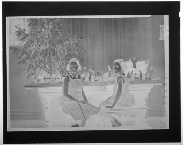 Editor: This untitled photograph by Martin Schweig shows two girls in matching dresses sitting on a bench in front of a Christmas mantel. The photographic negative feels formal yet intimate. How do you interpret this work, especially considering its historical context? Curator: It's fascinating how this image, likely a personal snapshot, finds its way into a museum. Think about the cultural rituals of family portraiture, particularly around holidays. The matching dresses suggest conformity, while the Christmas mantel is a symbol of domesticity. What’s being preserved and presented when we elevate such an image? Editor: That's a great point. It makes me wonder about the power dynamics involved in deciding what becomes art and what remains a private memory. Thank you! Curator: Precisely! And how the museum's role shapes the narrative around it. Food for thought, indeed.