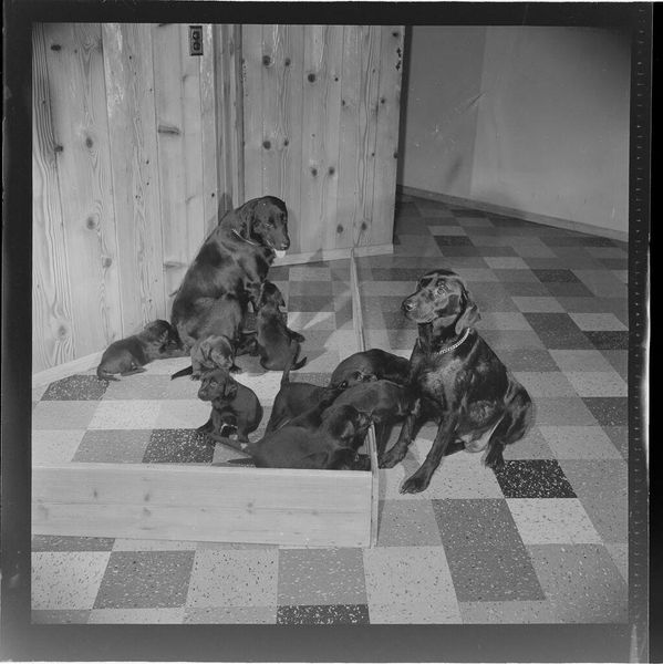 Editor: So, this is Jack Gould's "Untitled (puppies on checkered floor)," and honestly, it just makes me smile. It's a small black and white photo, and there are just puppies everywhere! What do you see in this piece? Curator: Oh, it's pure joy, isn't it? For me, the rough edges of the photo, the clear imprint of its materiality, feel like a half-remembered, wonderful dream. It reminds me that art doesn't always have to be serious; it can be about capturing a fleeting moment of pure, unadulterated puppy love. Editor: That makes sense. I hadn't thought about the 'dreamy' quality before. I was just overcome by all the cuteness. Curator: Exactly! Sometimes, the best art is just like that: immediate and irresistibly charming.