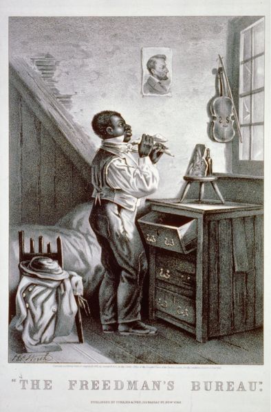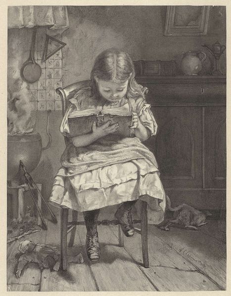 Editor: This painting, "Artist's Mother by the Spinning Wheel," by Albert Küchler, dates between 1818 and 1886. Painted with oil paints, its monochromatic quality gives it a somber, almost austere, feel. What historical narratives are evoked for you when you look at this piece? Curator: The image presents an intriguing commentary on 19th-century life. Genre paintings like these, particularly those depicting domestic scenes and labor, became popular. It signifies a broader interest in the lives of ordinary people. Consider how this seemingly simple portrait also subtly reinforces social structures; the mother is depicted engaged in a traditional domestic task, her role within the home defined by this activity. Is that not a little telling? Editor: It is interesting to see domestic work portrayed. How did paintings like this affect or reflect societal views on women at the time? Curator: Paintings such as this helped solidify certain gender roles in the collective consciousness. While ostensibly celebrating motherhood and domesticity, they simultaneously constrained women within the domestic sphere. Art institutions and the patrons who supported them largely dictated the artistic narrative. Can you consider what it meant to see and not see diverse identities represented? Editor: So, it's not just a quiet scene, but a representation of complex societal forces. It makes you consider art as a reflection of more than what's obviously in frame, doesn't it? Curator: Precisely. Art is rarely created in a vacuum. This work serves as a reminder of how social expectations can shape not only life, but its representation as well. I am intrigued by what further insight it grants into gender discourse as it exists in culture. Editor: That's a great perspective to keep in mind when looking at art! Curator: I am pleased you see its potential and implication.
