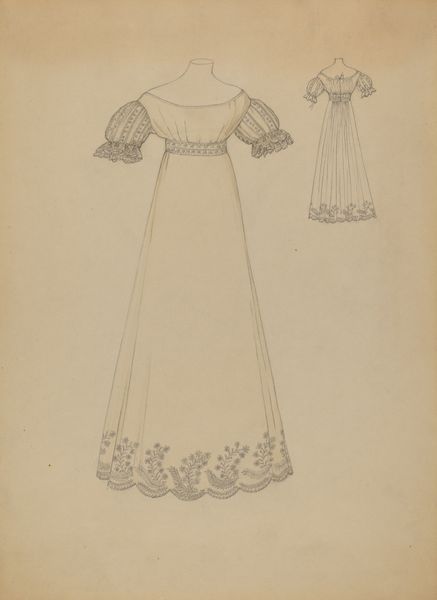 Curator: Looking at this preliminary pencil sketch from around 1936, titled "Nightgown," by Rosalia Lane, one gets a sense of both fragility and an almost architectural consideration of form. What strikes you most about it? Editor: It feels so...contained. The high neck, the long sleeves—it’s a far cry from the breezy negligee one might imagine. There's a strong element of modesty or perhaps even a kind of cloistered comfort conveyed through the lines. Curator: Indeed, the design emphasizes coverage, resonating with social mores of the time. But consider the delicate pencil work; there’s a lightness too. The ruffles, the pleats—they speak to an embrace of traditional feminine ideals through dressmaking, a time of intricate detailing in garments. What visual continuities might we find across fashion of the era? Editor: Perhaps echoes of Victorian sensibilities clinging on, that sense of restraint in contrast to the interwar period's experimentation. It's like a whisper of the past coexisting with a burgeoning future of simpler dress codes, which makes me question what this garment represents about the changing role of women in the household? Curator: Fascinating. Lane might have been working against or perhaps subverting certain historical associations, especially around privacy and femininity within domestic space. This intimate piece offers more than practical attire; it invites reflection on societal expectations and comfort as both aesthetic choice and material necessity. How did evolving technology in textiles play into her process? Editor: Exactly! Consider too how this image functions as a fashion mockup – part functional blueprint, part aspirational object of design in an era of mass-produced textiles – suggesting new patterns of both industrial labour and leisure. I mean, this object speaks volumes about both a highly personalised and highly commercialised landscape for women. Curator: So the sketch serves as a visual code carrying layered meaning that allows us insights into shifts in taste, manufacture, and underlying cultural forces influencing everyday lives and material possibilities during the period? Editor: Precisely. This image isn’t just about a garment. It tells a broader story of its historical context through form and intention. Curator: It serves as an evocative relic and reminder of shifting trends, all captured with light pencil strokes across paper, as it whispers to the contemporary observer through time, don't you think? Editor: Absolutely; I think this is far more than simply historical clothing—it embodies dreams and silent struggles of its day, which is always relevant.